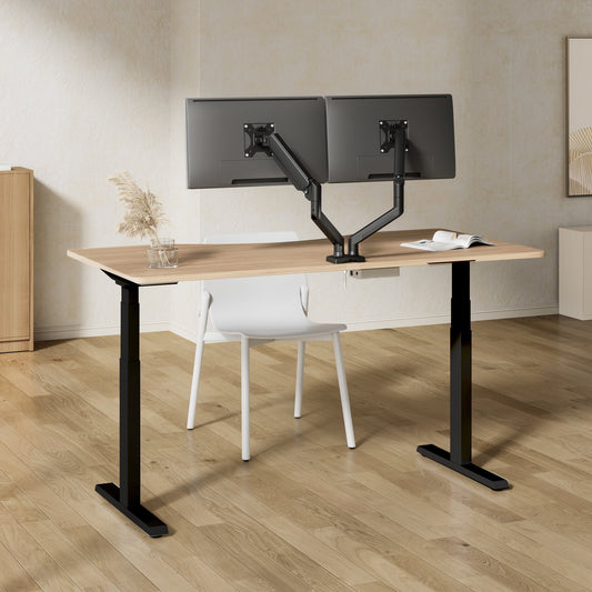 The right height depends on your posture. When you sit, your feet should be flat on the floor and your knees should be at a 90-degree angle. When working standing up, it is important that your arms rest relaxed on the desk and that your elbows also form a 90-degree angle. Many sit-stand desks have memory positions, which allow you to find your ideal height at the touch of a button.
